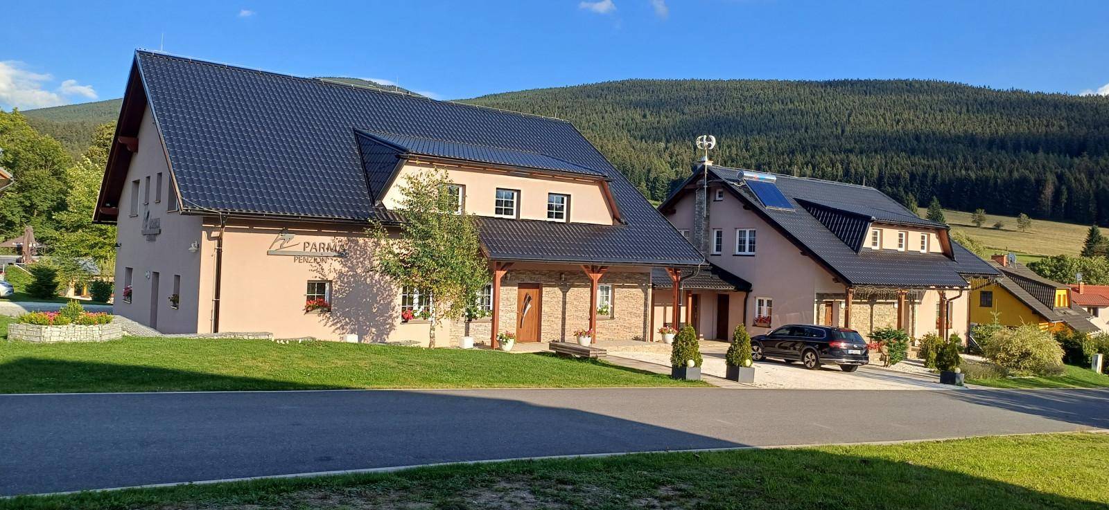 Krátký popisPohodlné ubytování ve stylových pokojích ve dvou budovách, výhodné ceny a skvělá poloha v Ostružné na hranici Jeseníků a Rychlebských hor. Využijte příležitost a ubytujte se u nás v Penzionu Parma, který je vhodný pro jednotlivce, páry, rodiny a i menší skupiny osob. Penzion Parma má společenskou místnost, kde podáváme snídaně, vybavenou kuchyňku pro hosty, dětský koutek, dětské hřiště prostě vše k příjemnému trávení volného času. Z Penzionu máte snadno na dosah lyžařské, turistické i cyklistické trasy. Rezervujte si ubytování v Jeseníkách právě nyní!