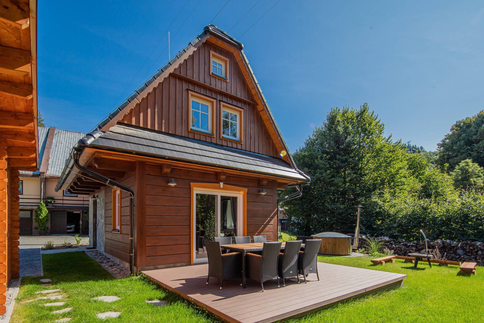 Krátký popisNabízíme k pronájmu nově postavenou a stylově vybavenou chatu s okrasnou zahradou s venkovním posezením a možností grilování. Na zahradě koupací sud se vzduchovou masáží a LED osvětlením - topení dřevem. Chata je umístěna v srdci Jeseníků na klidném místě 500m od ski areálu Kouty nad Desnou (je možné objednat SKI - BUS, který Vás zdarma odveze od chaty ke sjezdovce a zpět), nedaleko od známého zimního střediska Červenohorské sedlo a 10km od lázeňského města Velké Losiny, kde se nachází nově vybudované termální koupaliště. Za chatou protéká řeka Hučivá Desná. Ubytování na chatě Chata k pronajmutí poskytuje ubytování pro 8 osob ve 3 ložnicích. Ložnice, pokoje a další místnosti: V přízemí objektu se nachází obývací pokoj se smart TV a satelitním příjmem, kuchyní a krbovými kamny, dále koupelna se sprchovým koutem a samostatné WC. Nahoře jsou dva oddělené pokoje a WC s umyvadlem. 1) pokoj pro 3 osoby (s manželskou postelí a jedna samostatná postel). 2) pokoj pro 3 osoby (s manželskou postelí a jedna samostatná postel), dále z tohoto pokoje vedou schody do mezonetu, kde se nachází další manželská postel (upozorňuji na nízkou výšku stropu v mezonetu). Sociální zařízení: Celkově se v objektu nachází 2x samostatné WC a 1x koupelna. Vytápění: V celé chatě je nainstalované podlahové vytápění, nebo lze vytápět krbovými kamny. Doprava, parkování: Příjezd po udržované cestě, parkování přímo u objektu. Možnost uskladnění kol, lyží a dalších věcí v uzamykatelné šopě.